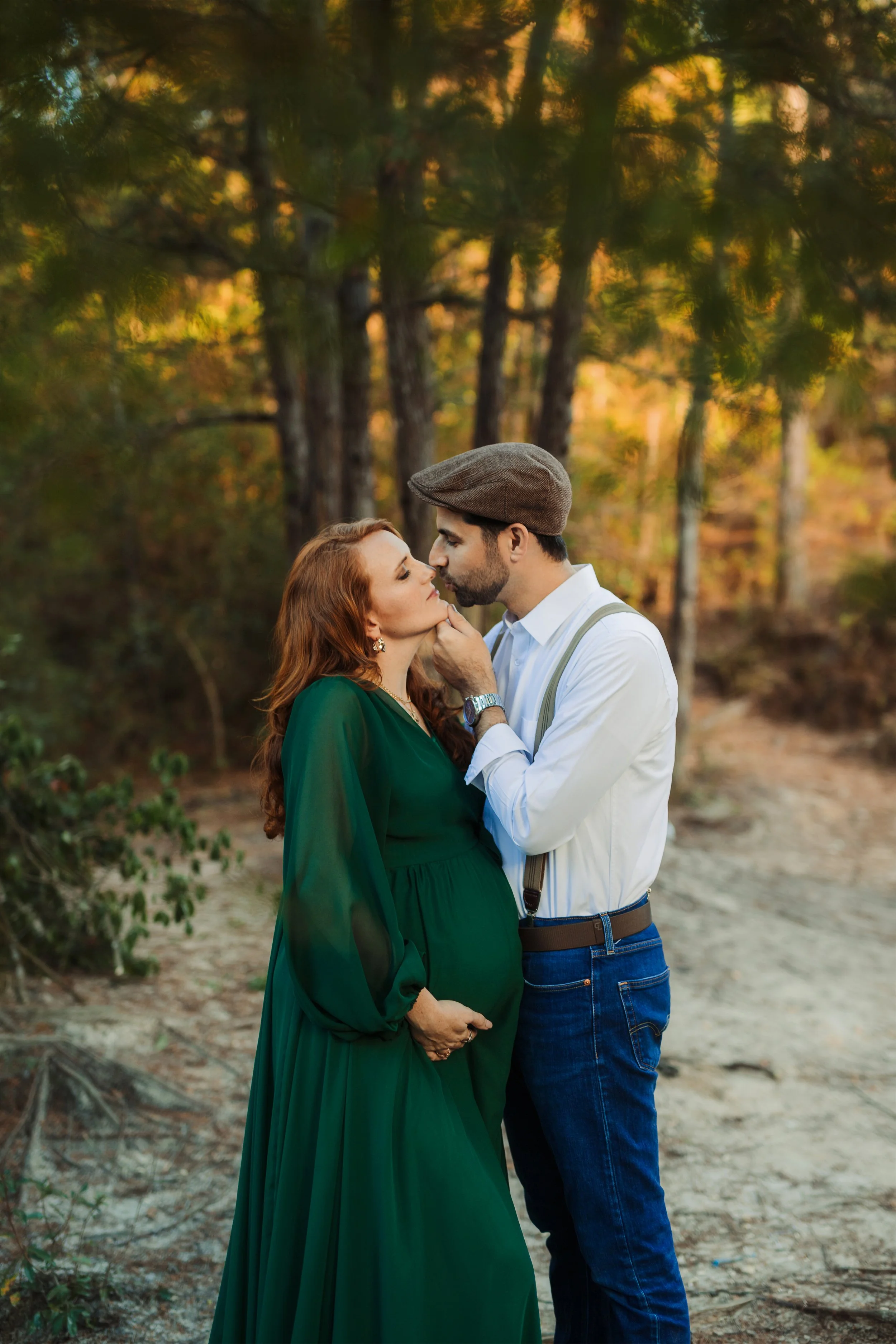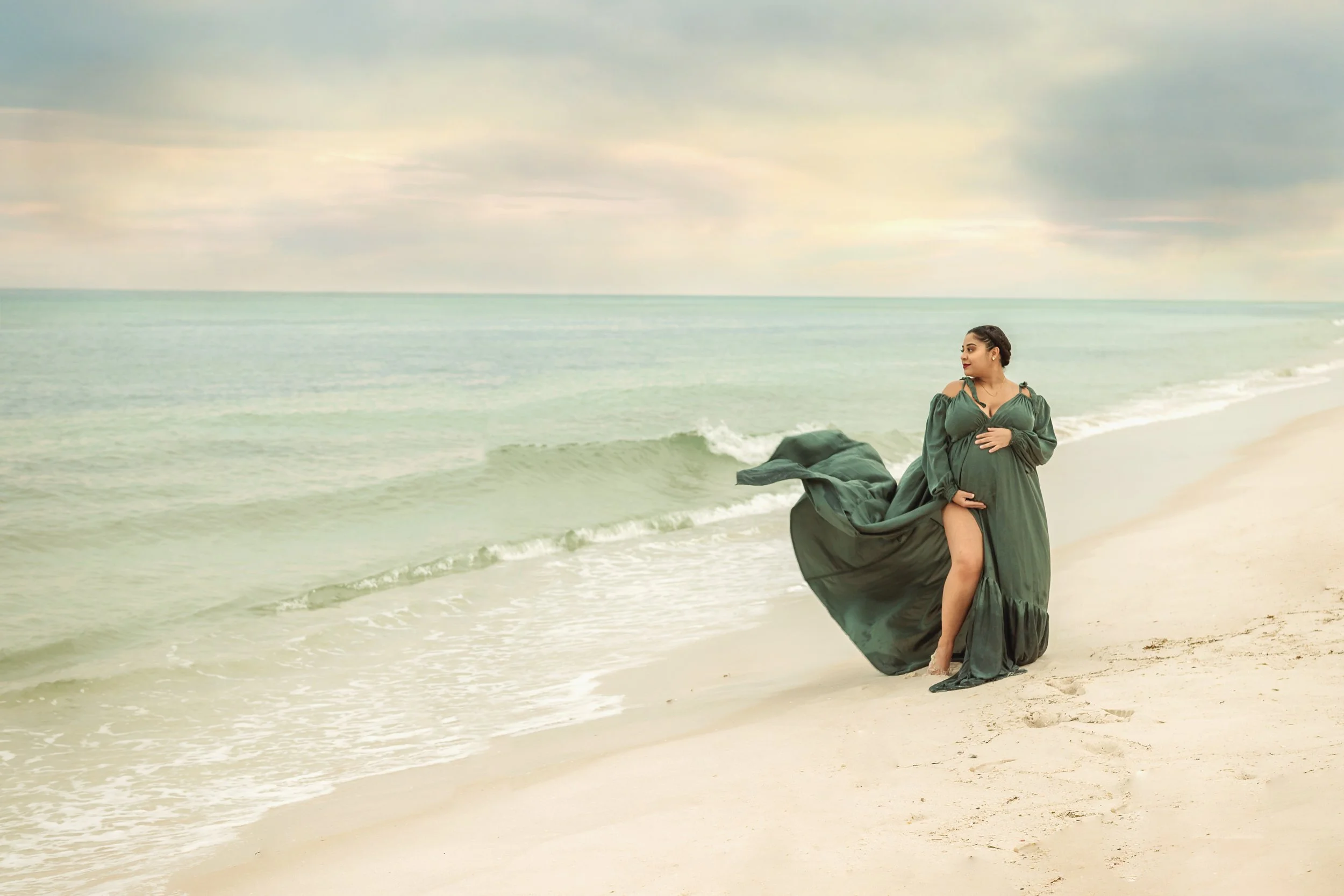 This beautiful hunter-green chiffon robe is a cross-body dress secured with a tie just above your baby bump giving you the perfect silhouette. This dress has bell sleeves and a flowy romantic skirt and is great for nonmaternity as well.