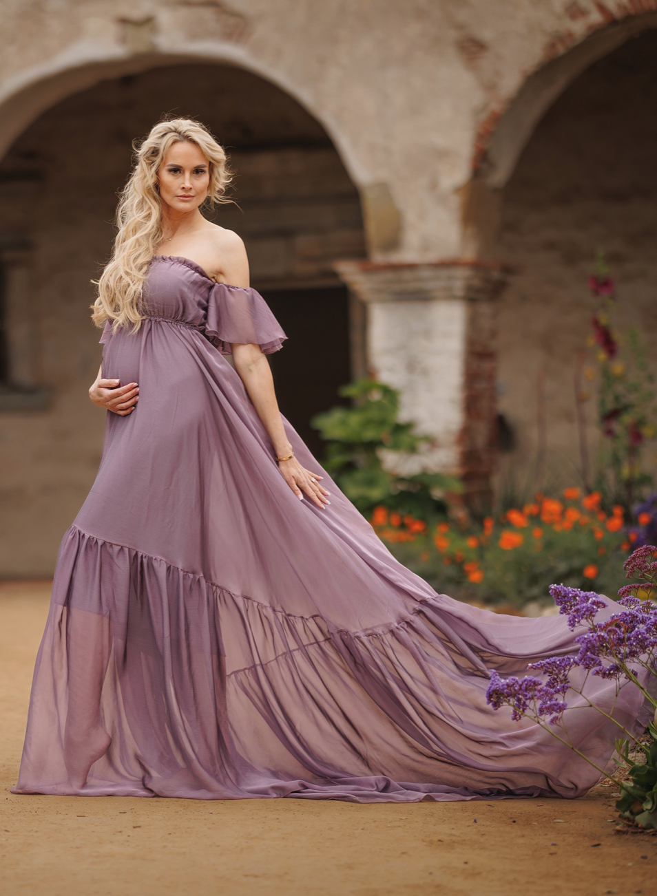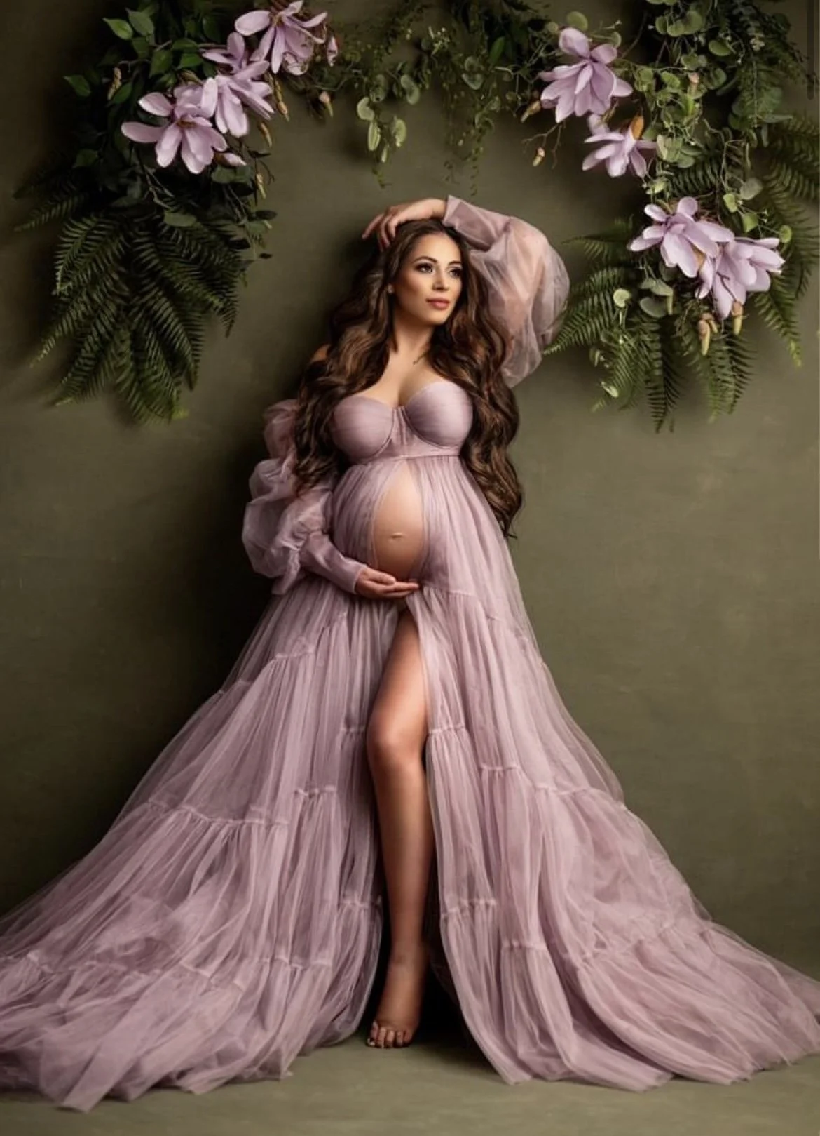 This boho gown is very flowy and moves effortlessly. It’s bump-friendly and can be maternity or non-maternity. It has a very Bohemian vibe. This dress is made of a tenured soft tulle fabric and can be worn with a slip.